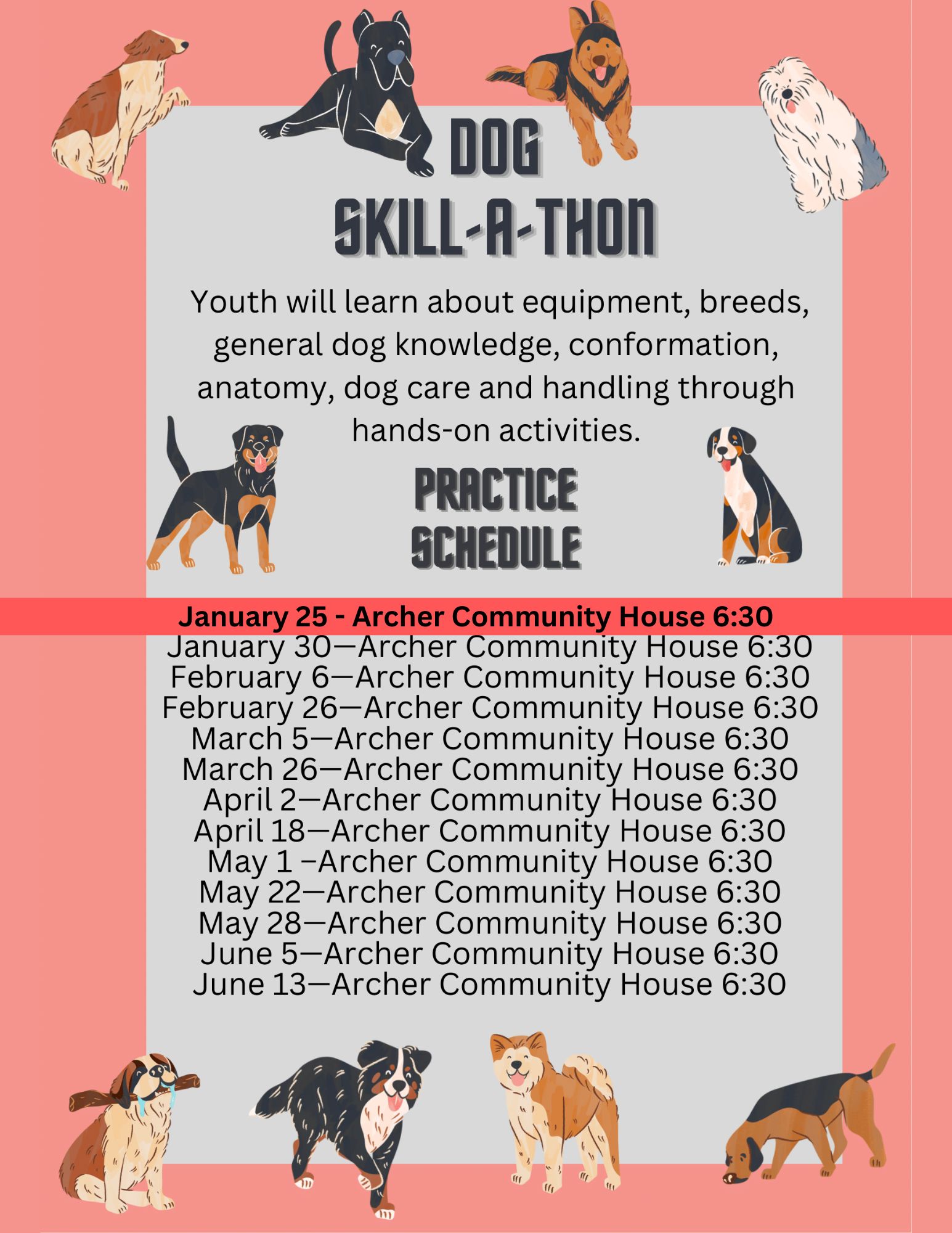 Dog Skill-A-Thon is an opportunity for youth interested in dogs. Youth test THEIR dog science knowledge. Youth will learn through games and hands-on activities. Youth will learn about equipment, breeds, general dog knowledge, conformation, anatomy and dog care and handling. No live dogs are needed.