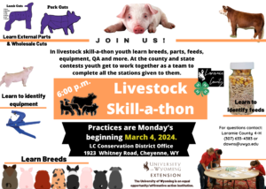 Are you interested in learning more about livestock – breeds, parts, feed, equipment, etc.? Come check out livestock skill-a-thon. This team-based program engages youth in learning and competing together. Practices will begin on March 4th at the Laramie County Conservation District Office (1923 Whitney Road, Cheyenne) at 6pm.. Questions? Contact the 4-H Office at 307-633-4383 or dawns@uwyo.edu