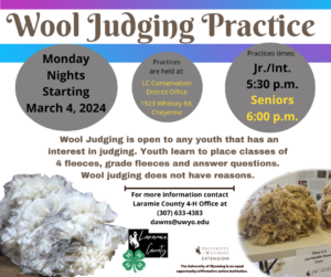 Wool Judging is open to any youth that has an interest in judging. Youth will learn to place classes of 4 fleeces, grade fleeces, and answer questions. Wool Judging does not have reasons. Practices will begin March 4th at the Laramie County Conservation District Office (1923 Whitney Road, Cheyenne). . Jr./Int. at 5:30pm and Seniors at 6pm. Questions? Contact the 4-H Office at 307-633-4383 or dawns@uwyo.edu