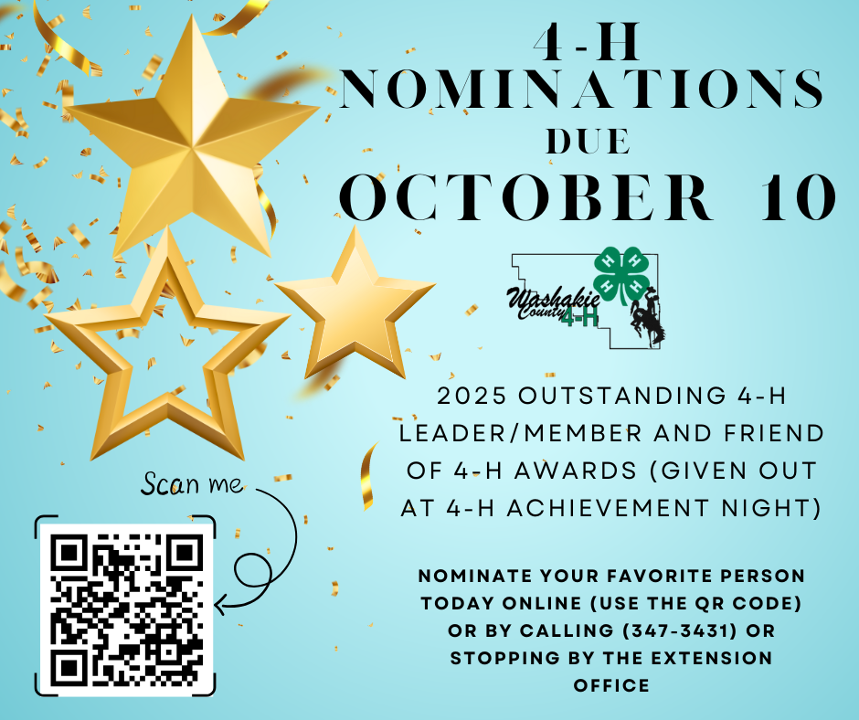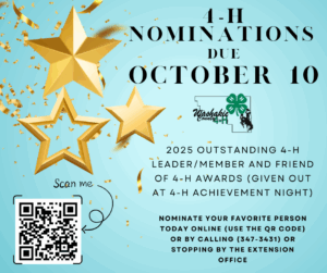 Have you nominated someone for 4-H Awards? Now is your time! Be sure to nominate your favorite 4-H member, leader and Friend 4-H. Nominations due October 10th and given out during 4-H Achievement Night!