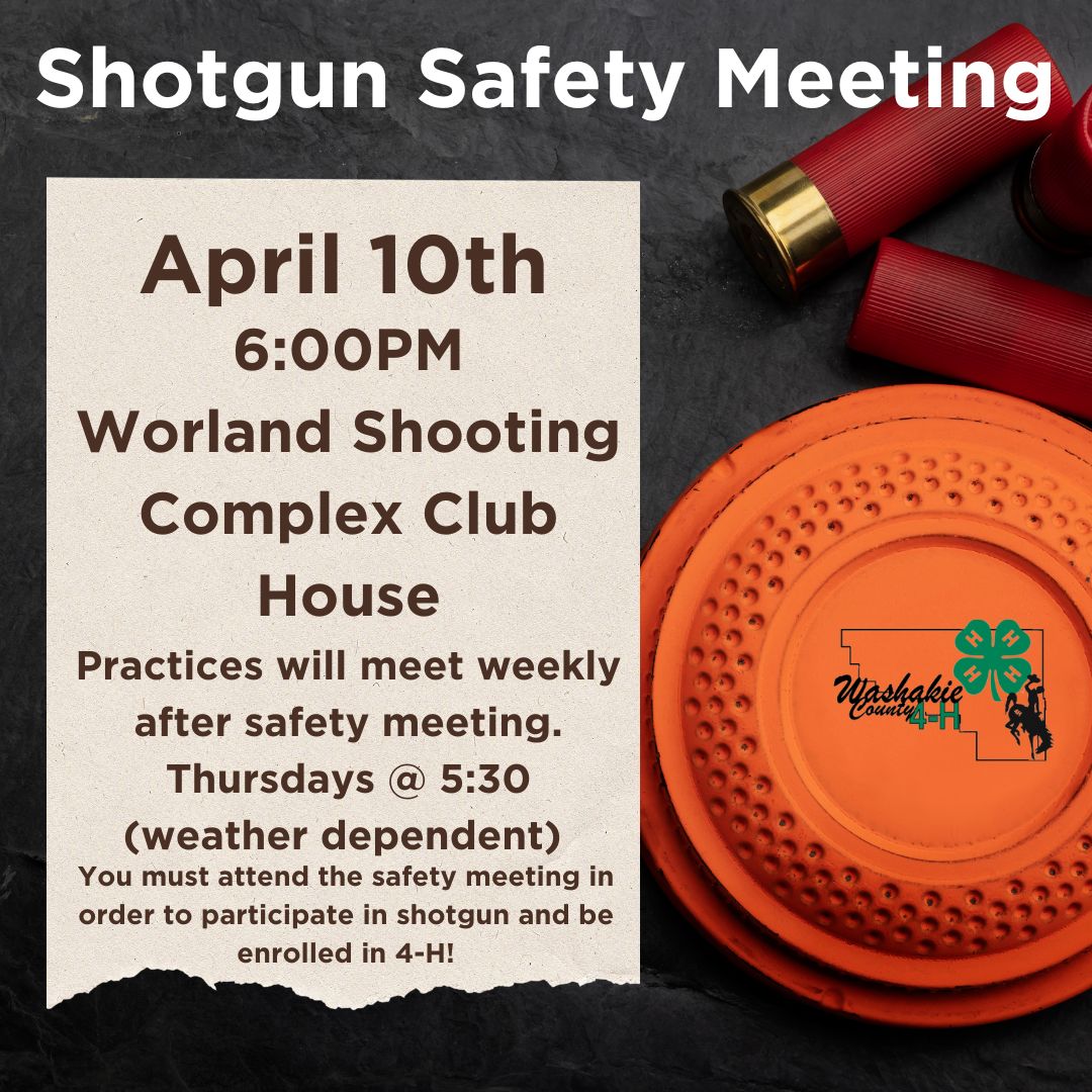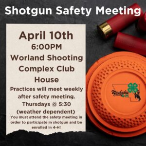 April 10th at 6 pm at the Worland Shooting Complex Club House, practices will meet weekly after the safety meeting on Thursdays (weather permitting). Make sure if you plan on attending Shotgun practices you MUST attend this Safety Meeting and enroll in 4-H!