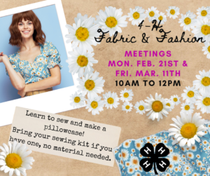 Open to any 4-Her who wants to learn more about sewing! Just RSVP by March 10, so we have enough supplies ready!