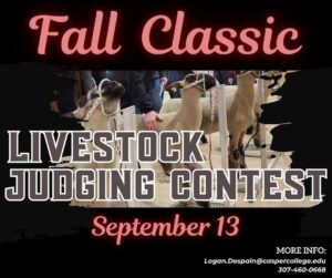 Join us for the Fall Classic Livestock Judging Contest on September 13, 2025. For more information, contact Logan.Despain@caspercollege.edu 307-460-0668