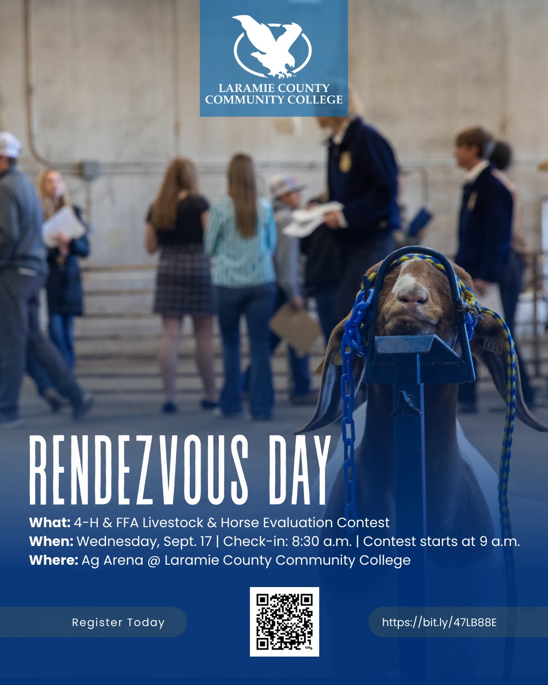 Mark your calendars for Rendezvous Day on September 17, 2025, at 8:30 am. Join for a fun day of 4-H and FFA Livestock and Horse Evaluation Contest at the Ag Arena at Laramie County Community College.