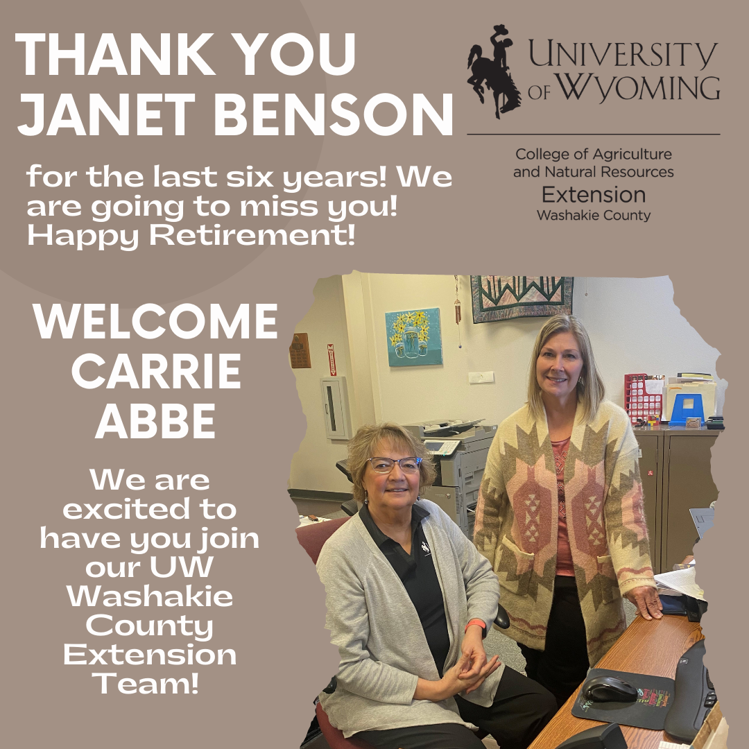 When you stop by the Extension Office you will see a new face behind the desk. We want to thank Janet for the last six years we are sure going to miss you but wish you well in retirement! We want to welcome Carrie Abbe to the UW Washakie County Extension Team!